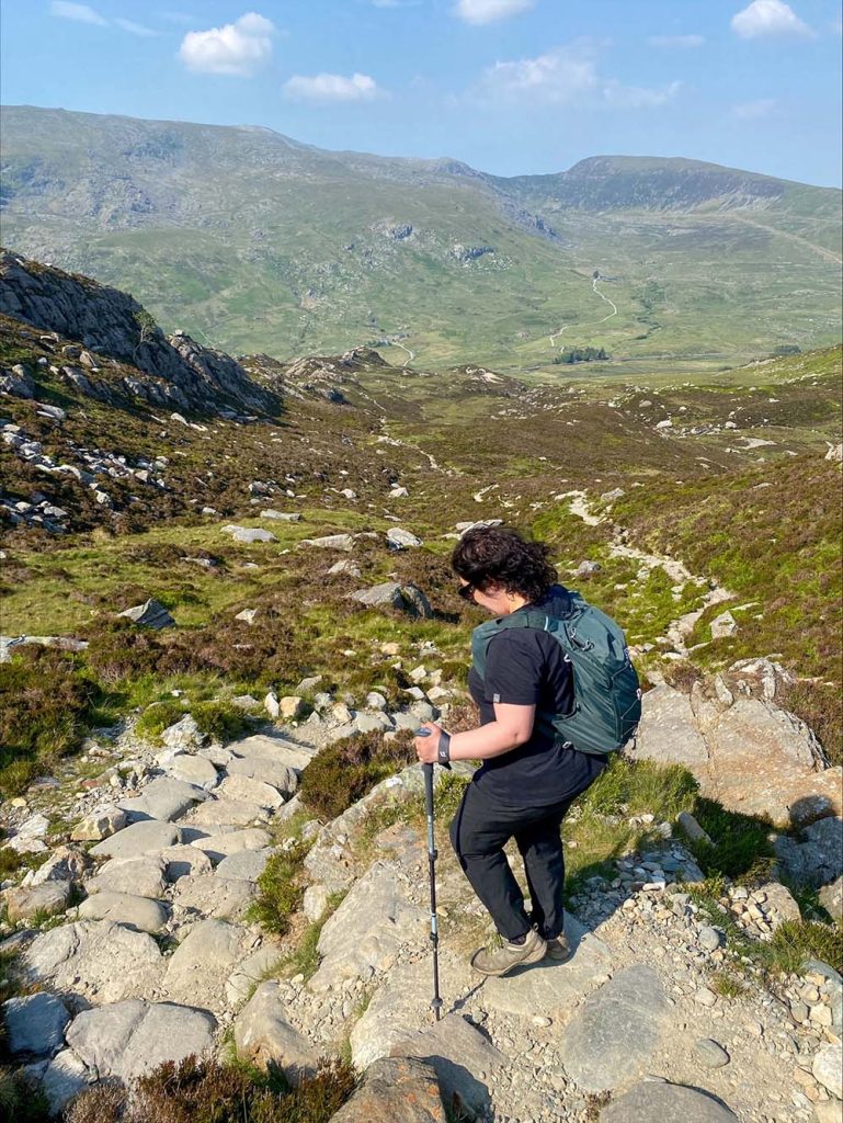Once over the stile you need to look for a rough but good path down Cwm Tryfan. This path will lead you down past the Heather Terrace.