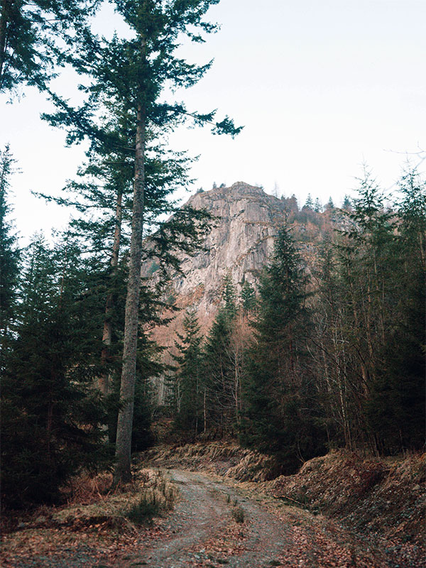 The first rest spot is as you reach fire road cutting through the woodland. From here the tall pines frame Raven Crag mirroring images of Yosemite Valley in California, where vertical walls of light rock dominate every scene.