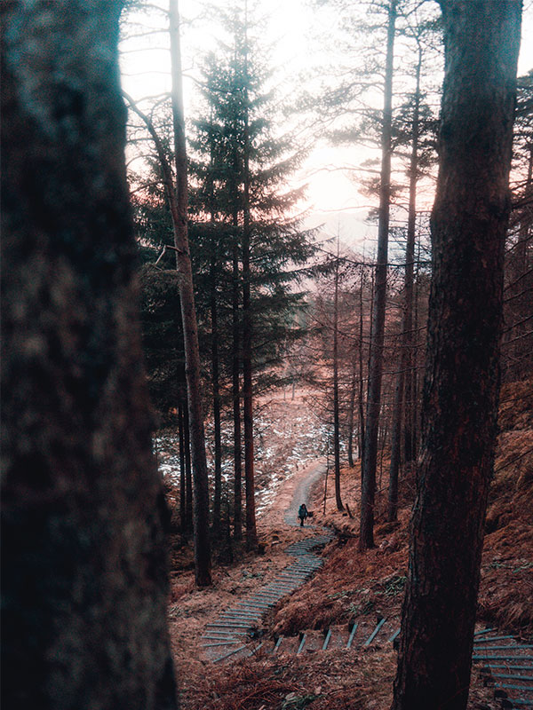 A short while later the path flattens out for a brief period and you approach the final climb up to the Crag, here wooden steps wind their way through the pine trees and you seem to gain the last 100m of elevation in to time at all.