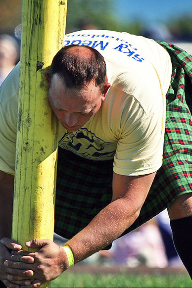 One of the most iconic images from the Highland Games, the aim of the competition is simply to toss the caber so that it turns end over end. The caber is usually made from a Larch tree and is typically 19 feet 6 inches (5.94 m) tall and weighs 175 pounds (79 kg).