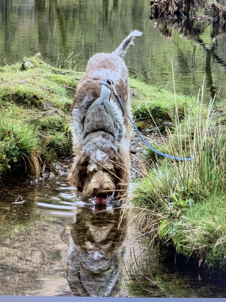 He’s a big fan of woodland, loves to snuffle through bracken and undergrowth. He’ll head for water if there is any and will paddle in the shallows happily for as long as we let him, but he doesn’t swim, which is unusual for his breed. That said, if there’s high ground, he wants to conquer it! He’ll willingly keep going up until he can go no further, and then adopts his ‘summit stare’, where he’ll gaze out across the landscape, loving the breeze, and all the scents it brings his way.