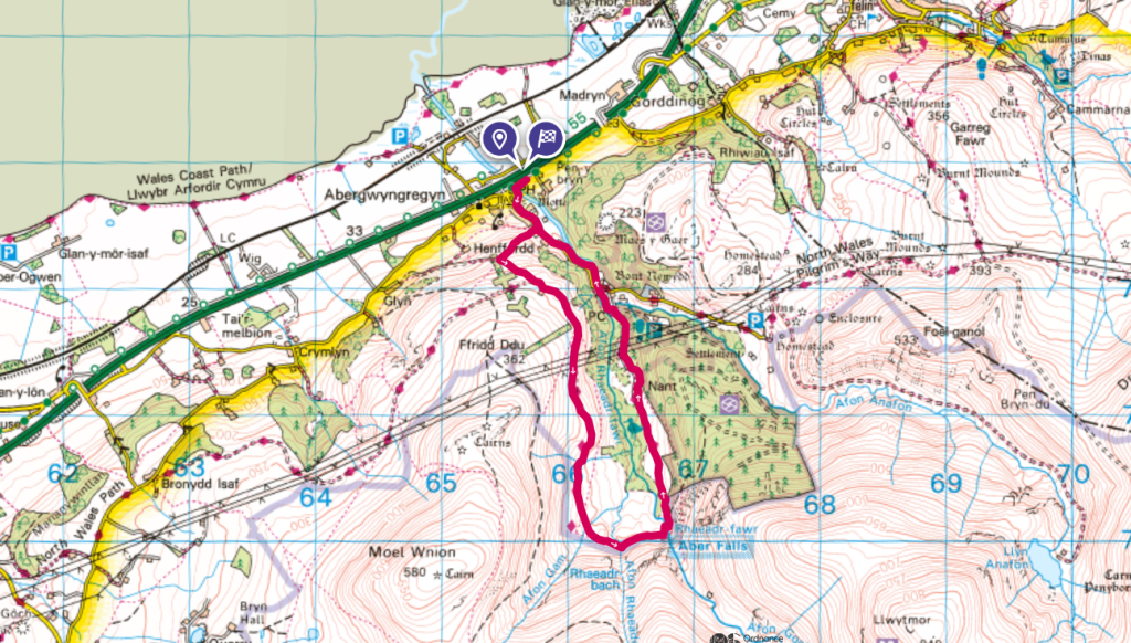 Rhaeadr-fawr/Aber Falls is one of Eryri’s most dramatic waterfalls. Situated at the northern foothills of the Carneddau, the waterfall is part of Afon Goch’s (Red River) final descent to the Menai Straits. The river plummets dramatically from a height of 120 feet, crashing into a shallow rocky pool before continuing towards the village of Abergwyngregyn.