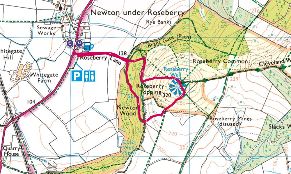 “For an easier, slightly circular route, walk from that same car park along the path (marked on OS Maps as Roseberry Lane) as if heading directly to Roseberry Topping. At the end of the path go through the gate but, instead of heading straight up, turn right into Newton Wood and follow the track up (to NZ 5762 1228), emerging from the woods at that point. Roseberry Topping will be on the left and an old stone-built ‘shooting lodge’ will be on an incline to the right. Walk between the two, turning left to follow the path up the rear side of Roseberry Topping. After resting at the summit and taking in the views, head back down the main path back to the car park, taking care on the descent.”