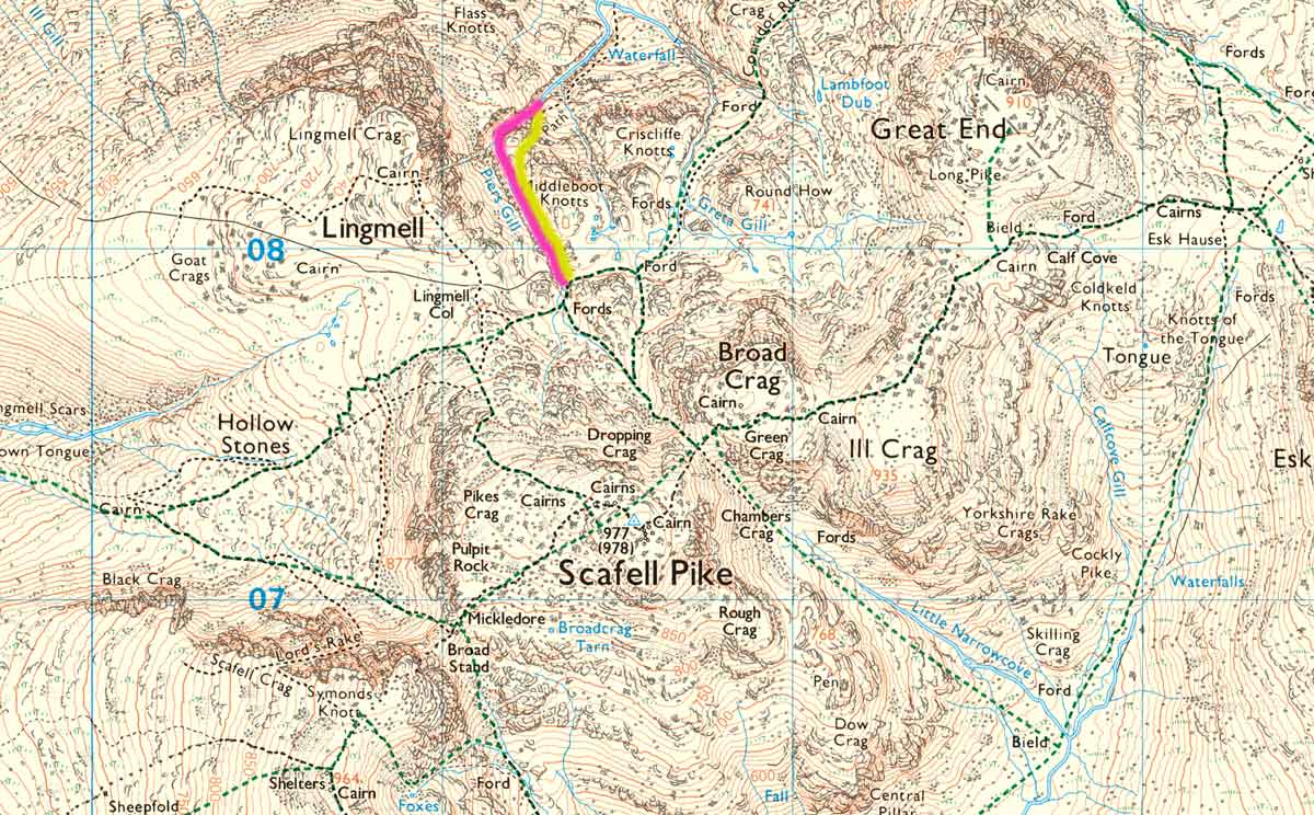 The top of the gill (marked in pink below) branches off the popular ‘Corridor Route’ and looks like an appealing choice, though the only path down is actually on the east rim of the gill (marked in yellow) and even that goes very close to the edge and has a rock step.