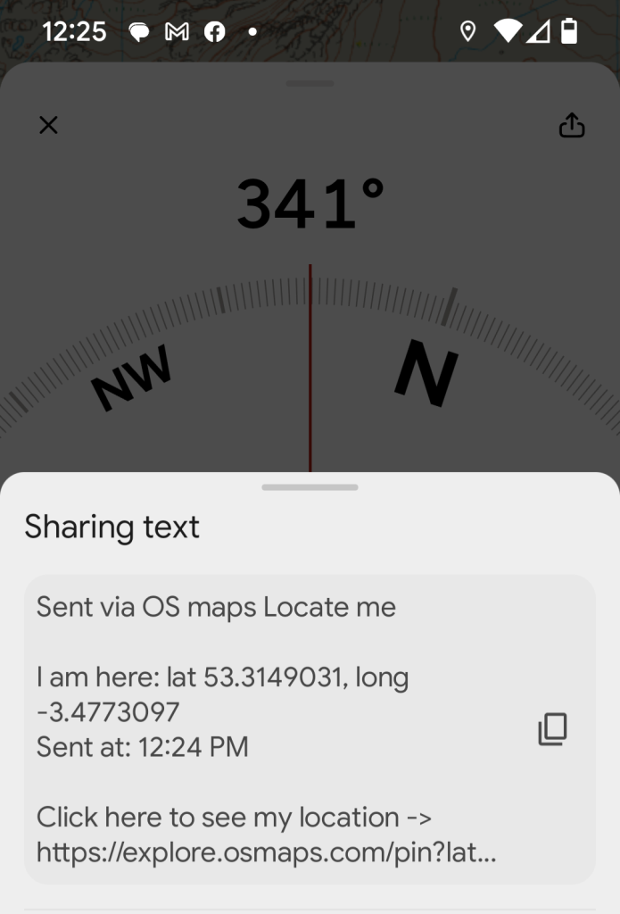 Choose which app you want to use to share your location or click on the copy symbol to paste the location into a message.