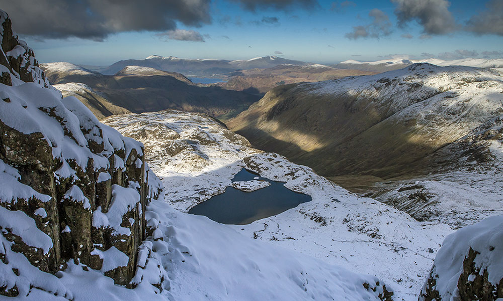 This mid-level route will take you into the hills of Lakeland and away from the popular vantage points of nearby Scarfell Pike and Styhead Tarn. Begin by following the well-trodden path to the tallest mountain in England (Scarfell Pike) before cutting it short and heading off in the direction of Sprinkling Tarn. Sprinkling Tarn is often missed by others, making it a fantastic place to visit and take in the views. Despite feeling like you are up in the clouds, this walk has no exposed summits or gruelling ridges and you’re unlikely to need crampons – yet you will still experience the magic of the mountains. You will need good navigation skills in poor visibility, check the forecast before setting off and always prepared for walks in the fells.