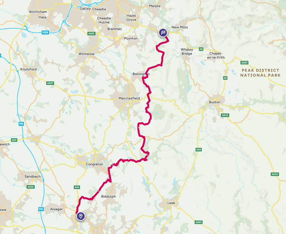 The route is largely on good bridleways and footpaths. It keeps you away from busy centres and in the countryside, though at Tegg’s Nose Country Park the cafe provides a useful place to either split the route in two or refuel.
