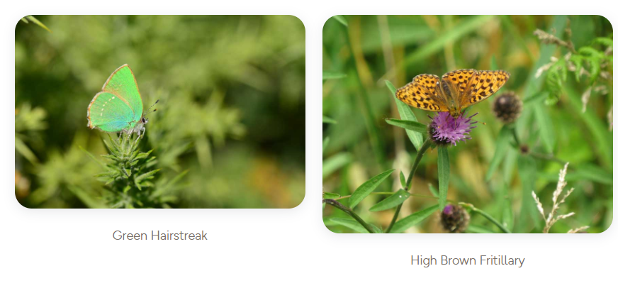 Emperor and fox moths, along with the green hairstreak butterfly, are typical of this area. If you look closely around the bracken stands, you might even spot the rare high brown fritillary butterfly.