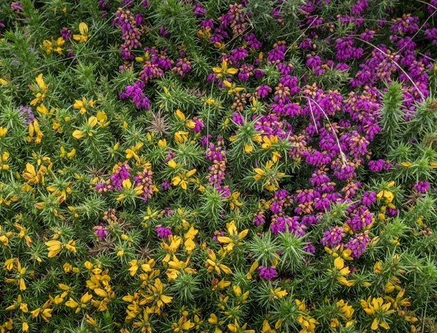 The upland areas are covered with dwarf shrubs like heather, bilberry, cross-leaved heath, and western gorse, as well as grasses such as purple moor and bristle bent. This diverse flora supports various wildlife, including adders, common lizards, red grouse, ravens, meadow pipits, and stonechats. During the spring and summer, the air is filled with the melodic songs of skylarks.